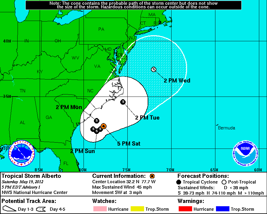 The National Hurricane Center officially declared the formation of Tropical Storm Alberto this afternoon, marking the first named system of the 2012 Alberto 5 Day ConeAtlantic Hurricane Season. The storm system is located off the coast of South Carolina, and is expected to move slowly over the next 24 hours before accelerating northeast up the East Coast (but remaining offshore). Maximum sustained winds as of Saturday afternoon were 40 kts (or 45 miles per hour), and Alberto had a minimum central pressure of 1007 millibars. The system was moving southwest at 3 kts (3 miles per hour). The National Hurricane Center’s cone of uncertainty (right) includes some of the forecast area, including the New Jersey Shore. We aren’t currently expecting the storm system to landfall in our area, but being in the cone of uncertainty generally suggests that interests in that area should keep a very close eye on the forecast over the next few days for any shifts or adjustments.