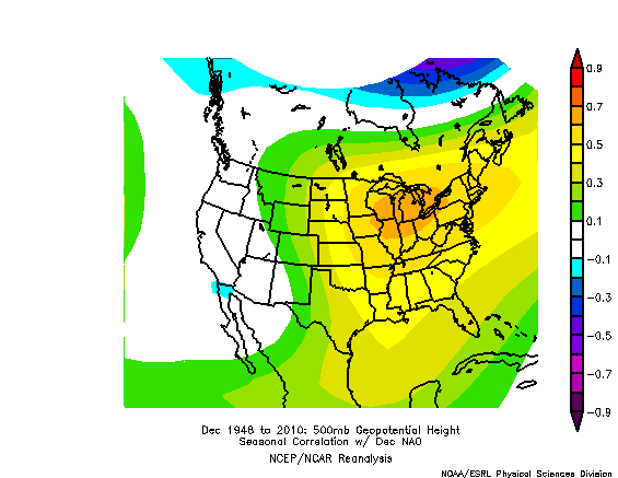 In December, here’s the NAO correlation to 500mb anomalies. Note it’s much stronger, 0.6 to 0.7 positive correlation in the Northeast: