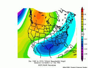 When we compare that to the PNA correlation in December – notice the correlation is only -0.1 to -0.2 in our area, much less of an impact whereas the NAO correlation is stronger in December.