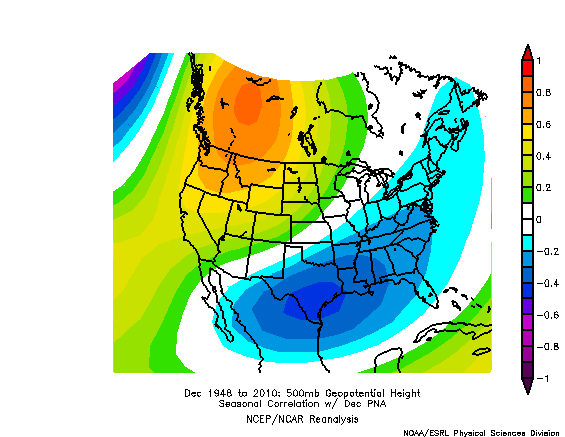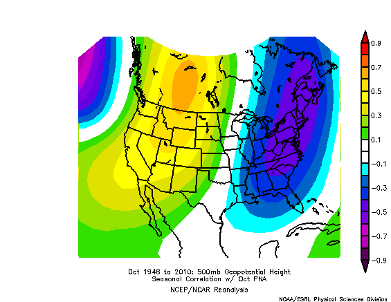 This is the October PNA correlation with 500mb heights. Notice the positive correlation in the West and negative correlation in the East. In other words, when the PNA is negative, heights are negative in the West, and positive in the East. When the PNA is positive, heights are positive in the West, and negative in the East. The correlation is about -0.4 to -0.5 in the entire Northeast, which is fairly strong.