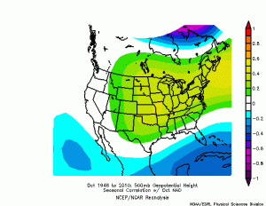 Now, below is the map of NAO correlation in October to 500mb heights:
