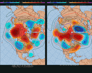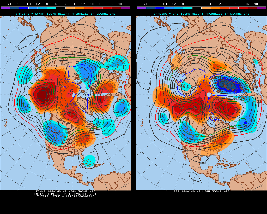 Here’s what the negative PNA / negative NAO / negative AO (artic oscillation) pattern looks like, as depicted by the GFS and ECMWF for days 7-10. Notice the positive height anomalies across the top of the globe, trough in the Western US, milder East.