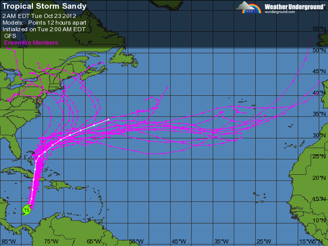 00z GFS Ensemble Tracks – most are out to sea, but some of them show “Sandy” approaching the East Coast.