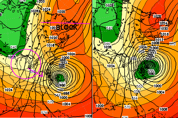“Blocking” pattern, with a series of blocking high pressure systems building into the North Atlantic. In this case, some of the strongest model guidance solutions are picking up on a blocking high building into Newfoundland as Sandy moves up the east coast. At the same time, an energetic disturbance moving through the Central US is sliding towards Sandy. As the two phase, Sandy cannot escape to the north and east because of the block. Instead, the disturbance over the Central US slides underneath her, phases, and a newly strengthened Sandy is forced to retrograde back towards the coast. We can see this in the graphic to the right from last nights European model — which showed a 950mb low pressure system making landfall on the coast of New Jersey.