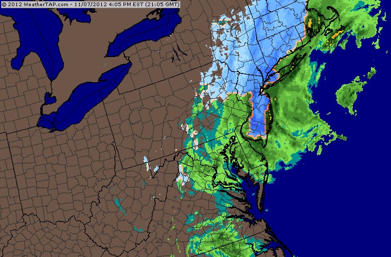 Radar during the snowstorm on November 7th, 2012 at 4pm. Heavy snow was falling through much of NJ, NY and CT.