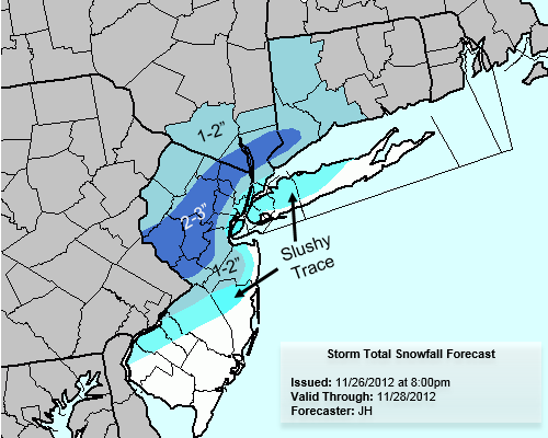 Our official storm total snowfall forecast for the storm on Tuesday, November 27th 2012.