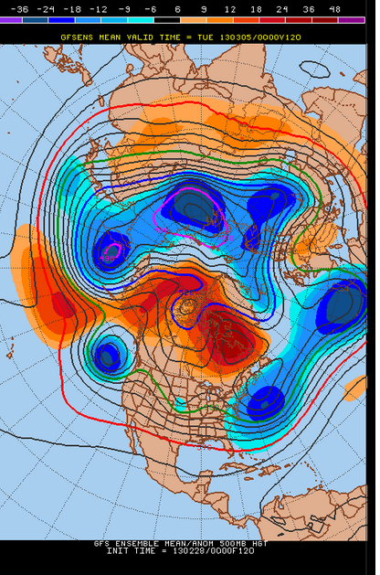 The 120 hour 00z GFS ensemble mean shows a potent storm system moving through the Central part of the country, with a strong NAO block to its northeast.