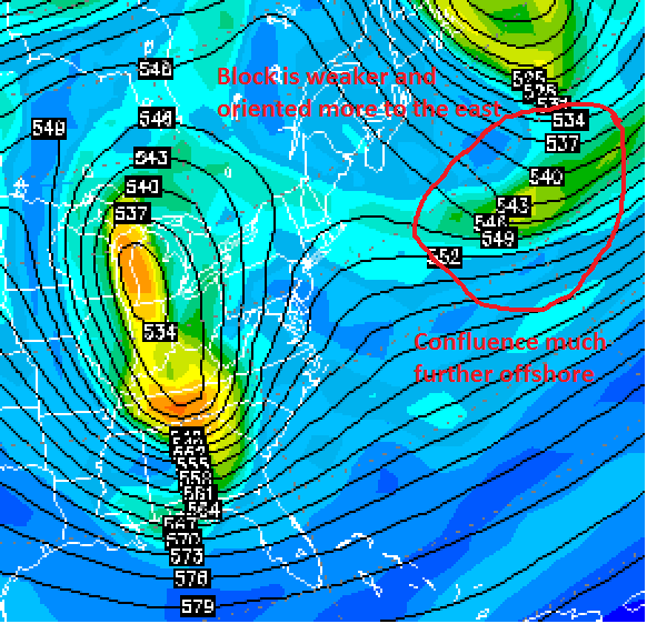 Another way to look at it is this: Both runs look nearly identical with the 500mb lows in strength and orientation, which is a good thing. However, last night’s run was fully phased when the confluence was strong near our area, and the run two nights ago was fully phased when the confluence was well offshore. Thus, last night’s run could not gain any latitude when it was fully phased, like what would be ideal for a major storm. This means that by the time the storm cuts off from the atmospheric pattern, which means it stalls or very slowly drifts eastward, its latitude is not any higher than it was when it initially phased. But two nights ago, there was room for the storm to climb north before it cut off, because the confluence was further east. Thus, last night’s European model run just missed giving us a blizzard, but instead gave one to the Mid Atlantic; whereas the European model run from two nights ago gave our area 1-2 feet of snow.