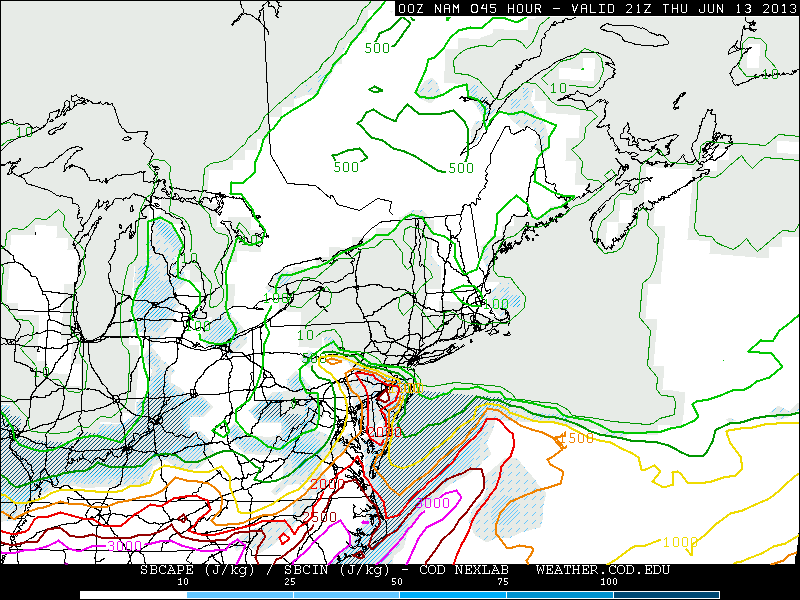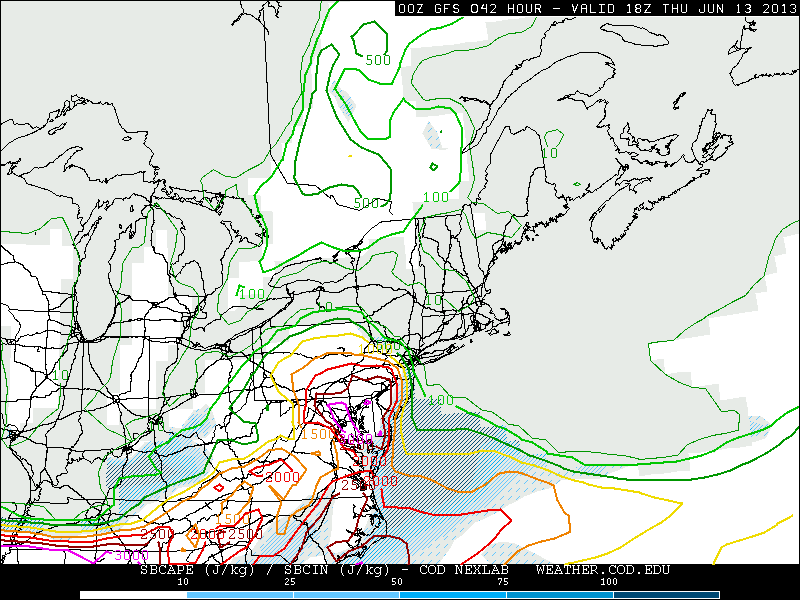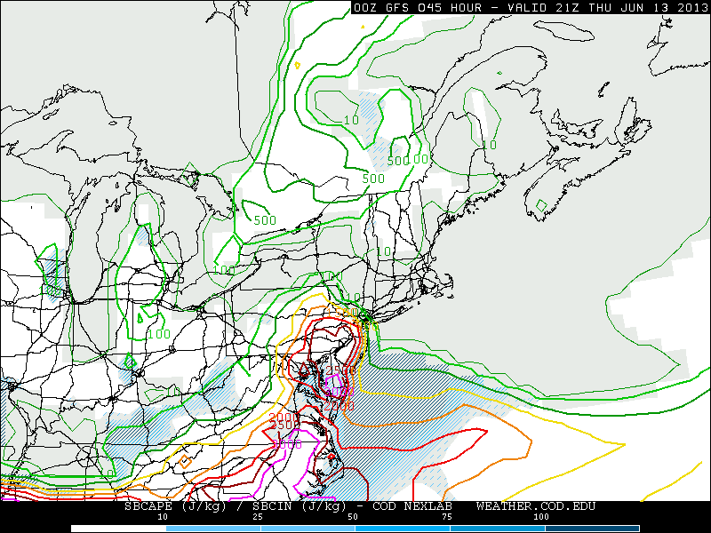 Let’s now take a quick look at the GFS’s surface-based CAPE. The first image is valid for 2 p.m. Notice how much higher the values are and how much further north its boundary is compared to the NAM. Also notice, however, that despite how much more latitude the boundary gains, that it still sinks rapidly southward once you head towards NYC, because of the colder ocean waters.