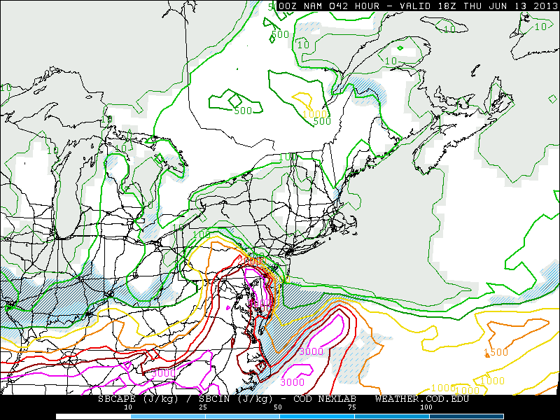The NAM, valid for 5 p.m., shows the strongest surface-based CAPE certainly inching north and east with the warm front, but staying to the south of central NJ, thus limiting the tornado threat. However, values of 1000 J/KG are found just SW of Trenton, NJ, which is a tad borderline for severe weather, but enough to be on alert. The values increase to 2000 J/KG as you head near Philly, which is conducive for severe weather. Of course, as alluded to earlier, the mode might be linearizing at that point, anyway. The NYC area still has essentially no surface-based instability.