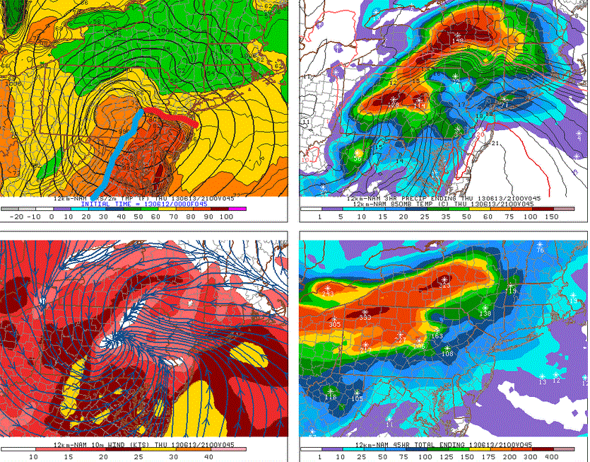 Also note the southeast surface winds that even exist to the south of the warm front in SE PA on the bottom left panel — when you combine that with the potent mid level winds from the WSW associated with this powerful storm, you get strong, deep-layer shear supportive for severe weather and even tornadoes. More will be discussed about the wind profiles later in this post.