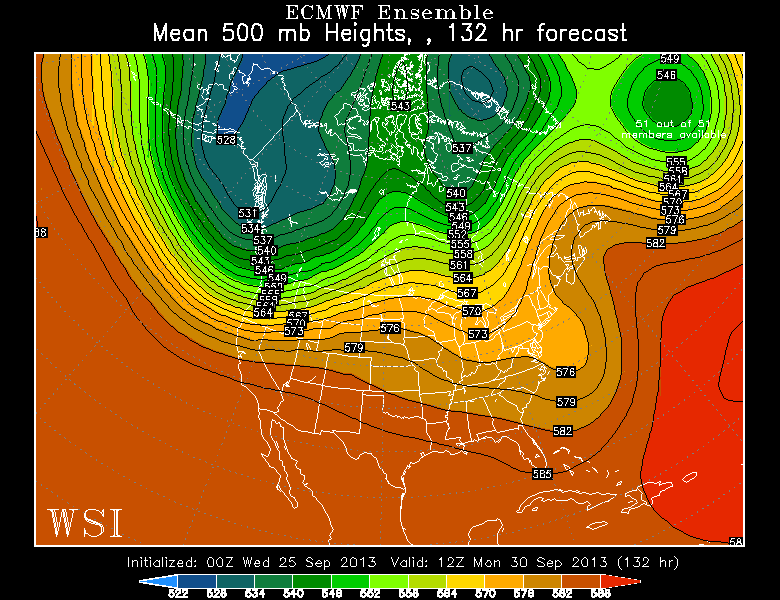 Last night’s European ensemble mean, valid for 8 a.m. Monday morning. Image is courtesy of the WSI model lab.