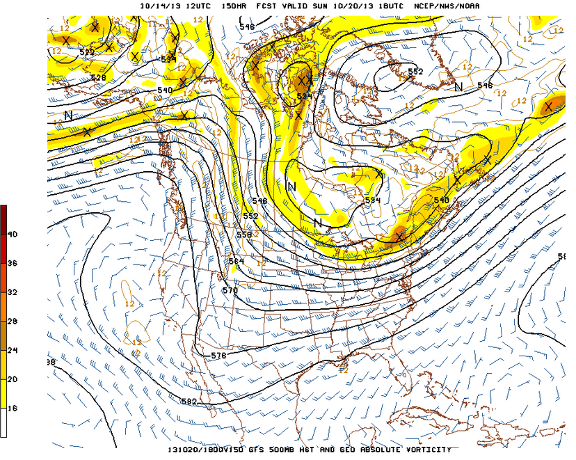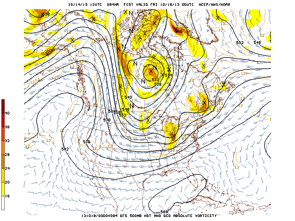 500mb and vorticity image from the GFS shows a potential brief break from unsettled weather on Thursday in the midst of shortwave ridging, but another storm system developing to our west potentially for Friday.