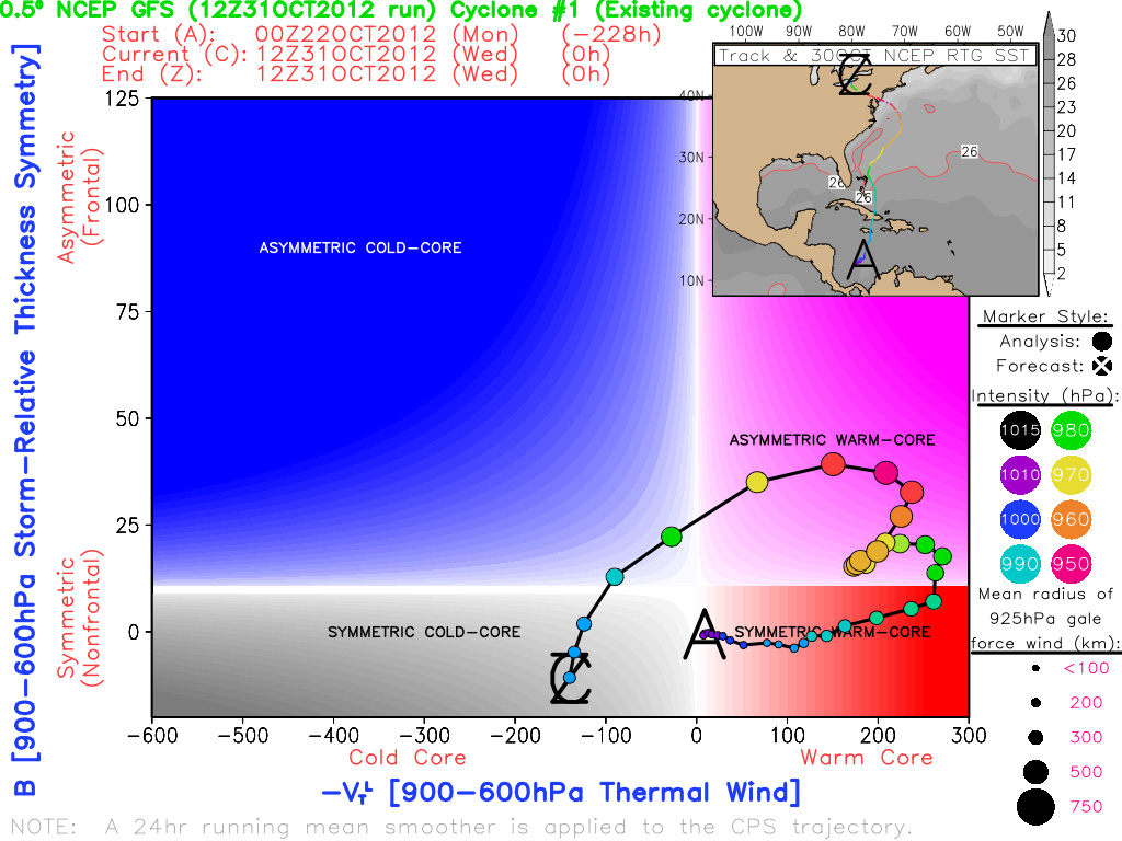 A phase diagram from Robert Hart (Florida State University) of Sandy helps to illustrate her transition from a warm-core symmetric storm to the dangerous hybrid known as a warm-core asymmetric storm. A dot was drawn every six hours, and warm colors indicate a strengthening storm. Note where the transitioning and the strengthening occurred relative to her actual track on the top-right.