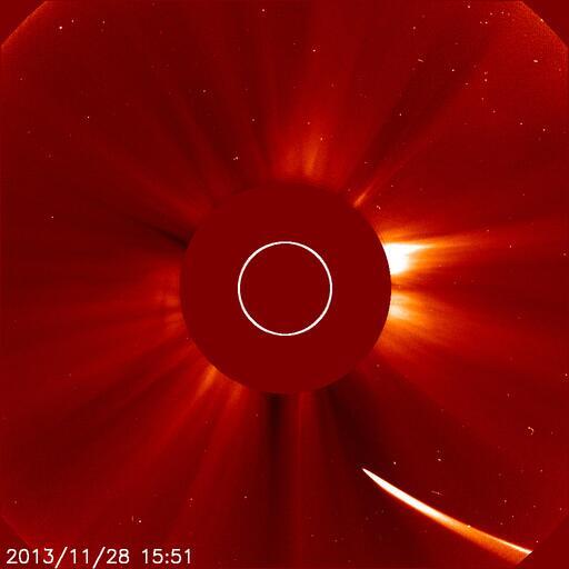 Comet ISON, the sungrazing comet which grabbed the attention of millions when it was discovered in September 2012, reached the end of its five million-year long journey towards the sun today. Unfortunately, for all parties involved, the Comet did not make it around the sun in one piece. ISON brightened dramatically yesterday, but then was seen to become less bright and elongate this morning. As it dove towards its perihelion, high resolution imagery showed no visible nucleus — and athe brightest part of the comet was in its tail. A steady dust trail also signaled the eventual demise of the comet, as its nucleus fragmented and apparently disintegrated just an hour or less before perihelion. As of now, ISON has not appeared on the other side of the sun on any of the handful of NASA cameras pointed at the sun specifically to observe it today.