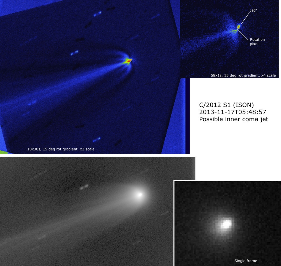 But the latest imagery and analysis seems to show that not only is the nucelus in one piece, but it looks to be quite a healthy comet with a sustained sunward facing jet. The volatiles which are burning off ISON are creating quite a spectacle with the long tail and plentiful colors as seen on the images above.