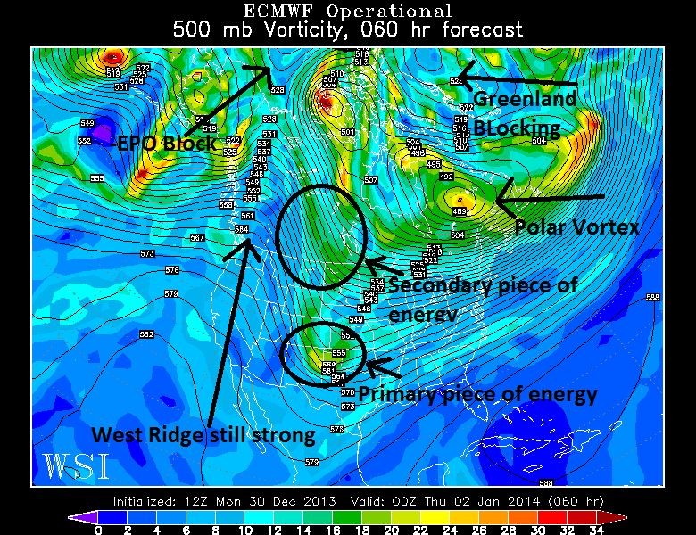 The image above shows today’s 12z European Model at the 500mb level, valid for Tuesday evening. There are several key pieces labeled which indicate the potential for a big storm. Although the storm itself is still a few days away, the fact that this setup is in place within 36 hours gives us a bit higher confidence in a snowstorm of some kind.
