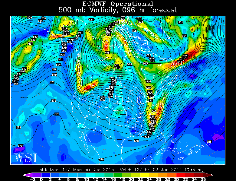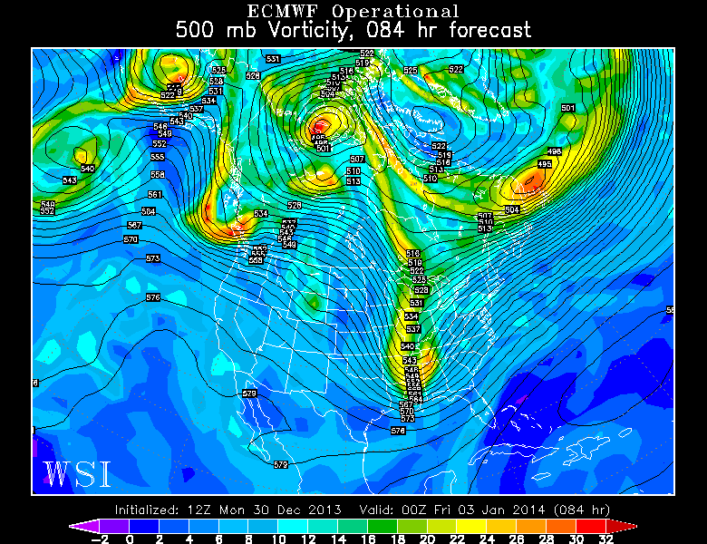 Today’s European Model at the 500mb level valid for Friday morning shows a big storm with strong positive vorticity advection streaming into our area. Image credit goes to the WSI Model Lab.