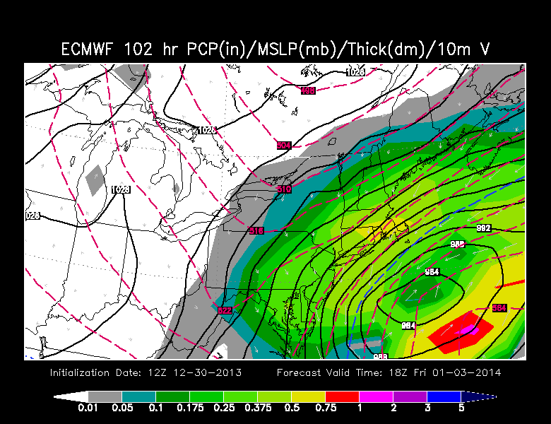 Today’s 12z European Model at the surface, valid for Friday, shows a 984mb low pressure system off the coast, hitting the area with heavy snow and strong winds. Image credit goes to the WSI Model Lab.