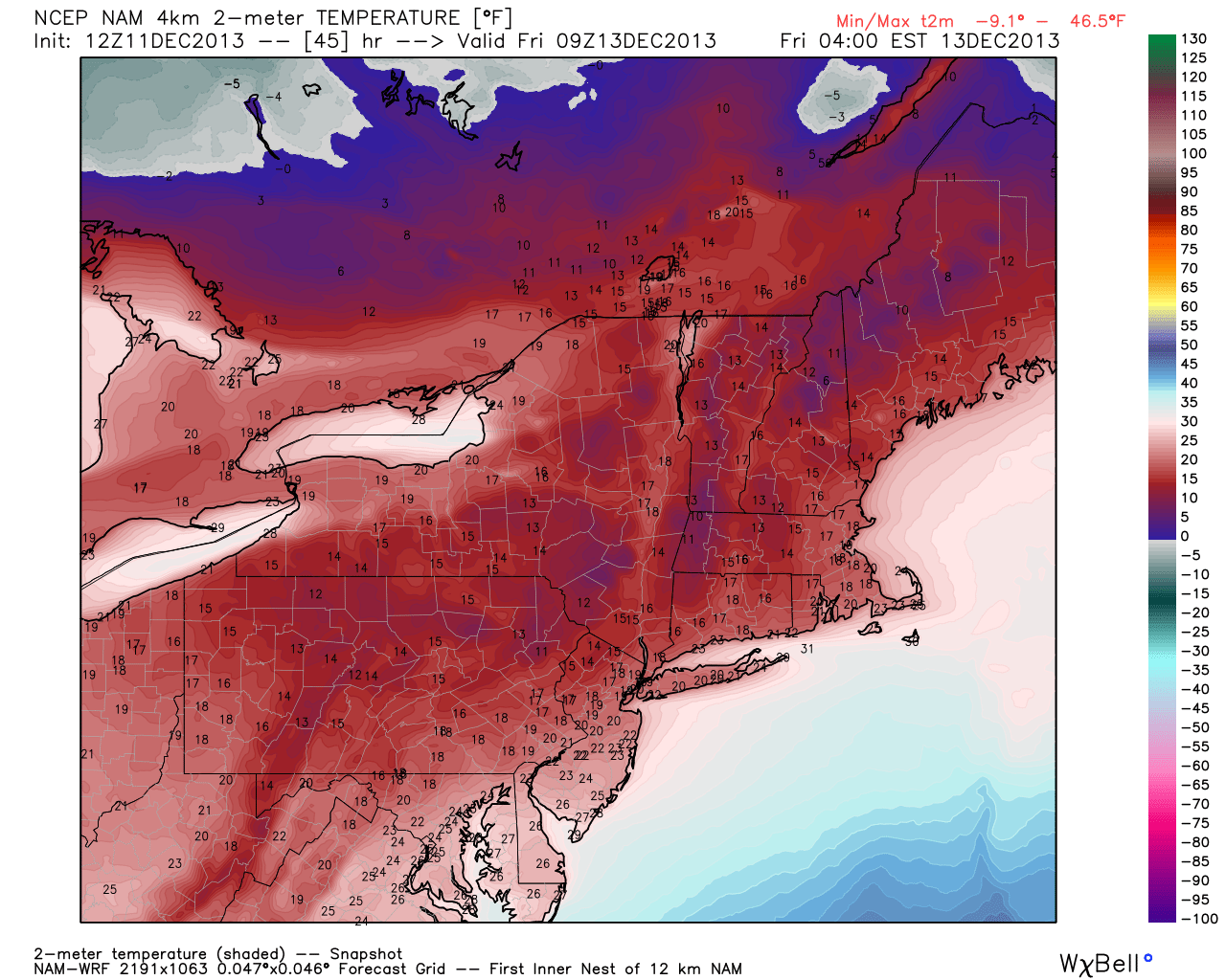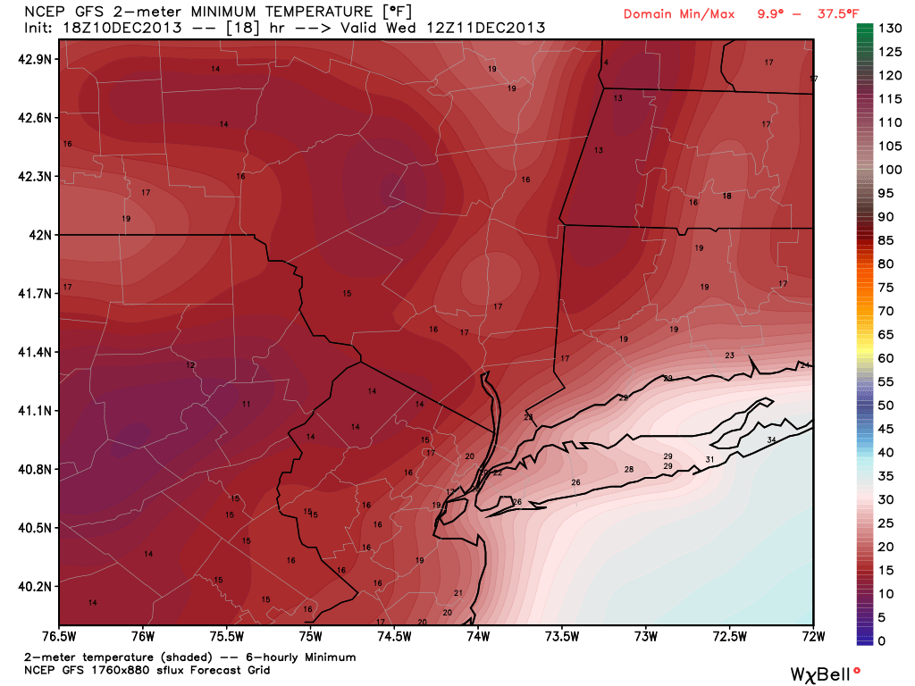 Today’s 18z GFS valid for tomorrow morning shows low temperatures primarily falling in the teens in the interior, and low 20s in the city. Temperatures on Long Island will be a bit colder than what this model is showing — probably in the low 20s as well. Image credit goes to weatherbell.com.