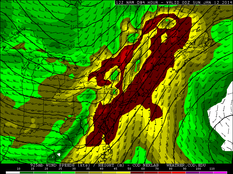 NAM model shows strong winds just above the surface, at the 925mb layer, on Saturday.