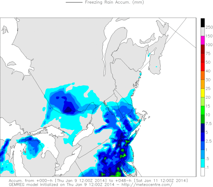 Total ice accumulation from today’s 12z RGEM model, in millimeters. The conversion is 25.4 millimeters to 1 inch.