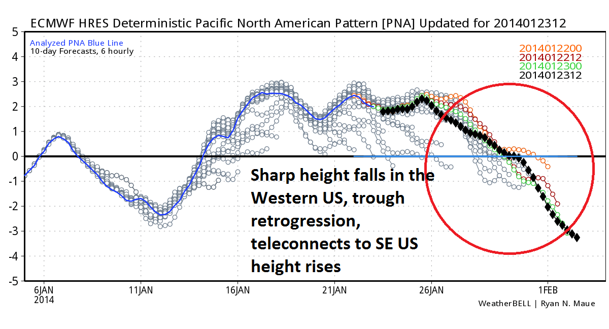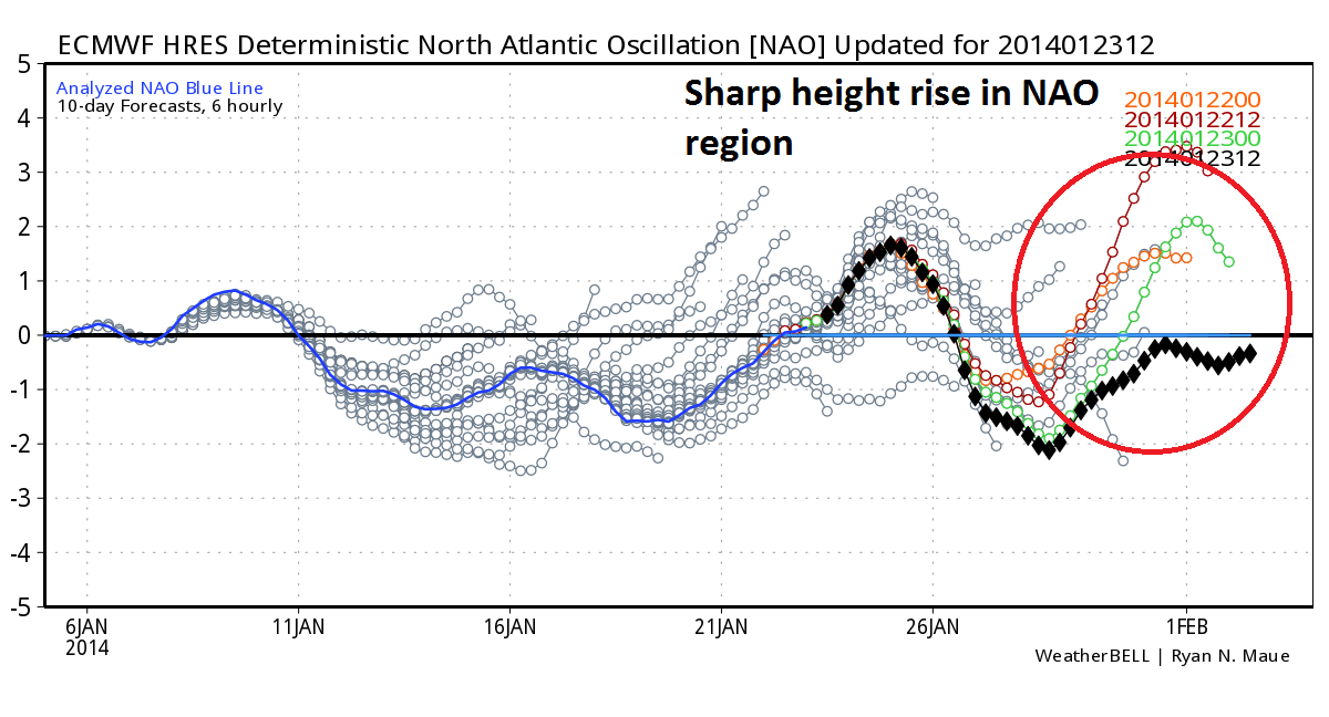 Later next week, we have an initial pattern of higher than normal heights around Greenland with a fairly strong negative NAO. That particular signal should be oscillating toward neutral or even positive by the beginning of February. When we see a rapid increase in NAO values, usually on the order of at least 2 standard deviations, it indicates height rises along the SE US coast. That is a cyclogenesis / stormiess signal often noted by Heather Archambault, who researched the impact of NAO modality change and its relationship with east coast storms.