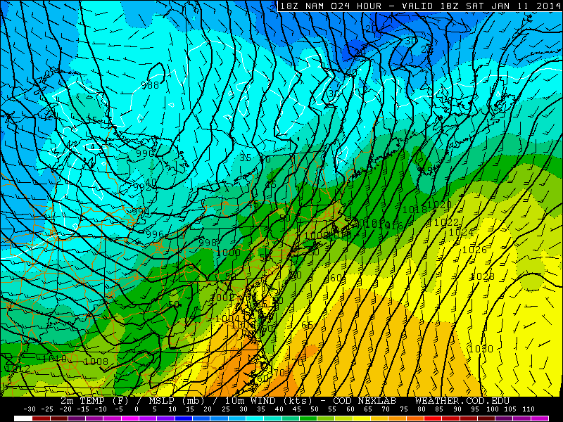 Today’s 18z NAM valid for tomorrow at 1:00pm shows a 988mb low in SE Canada with a cold front draped across the Appalachians.