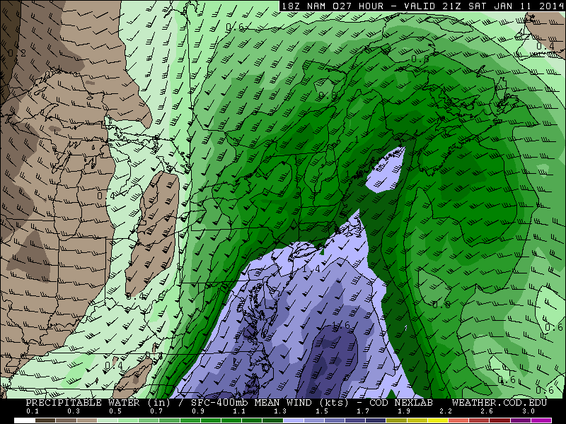 Today’s 18z NAM valid for 4:00pm tomorrow shows an area of very high precipitable water values streaming into the northern Mid Atlantic, an indicator of a significantly moist atmospheric column. This supports the potential for heavy downpours.