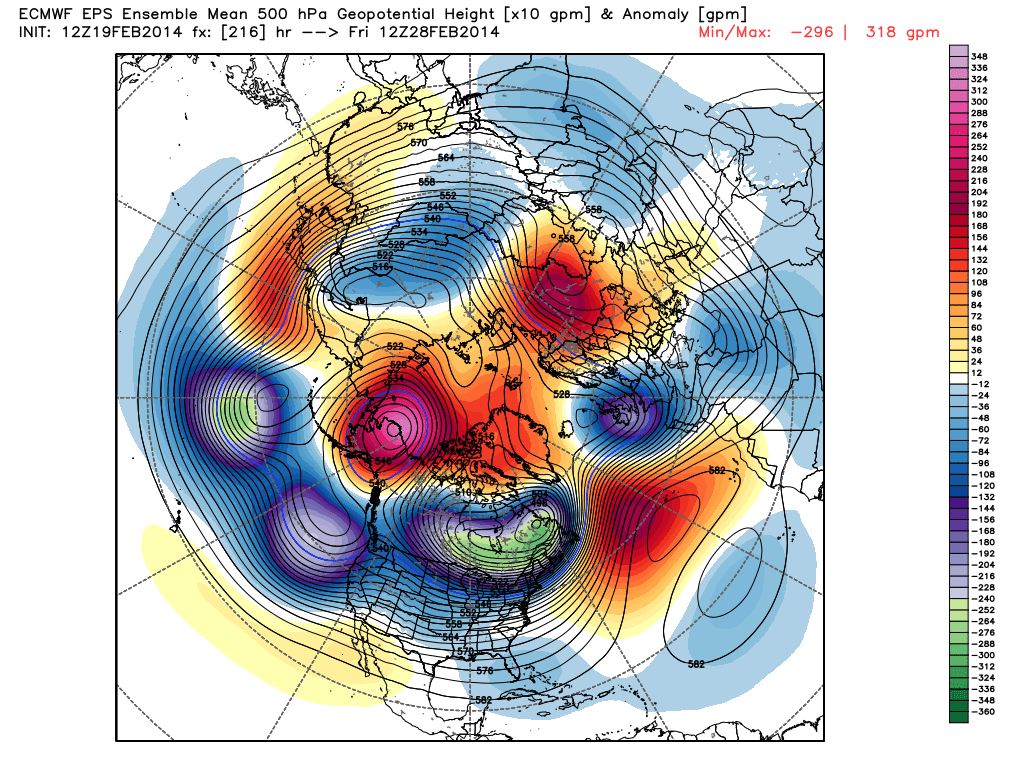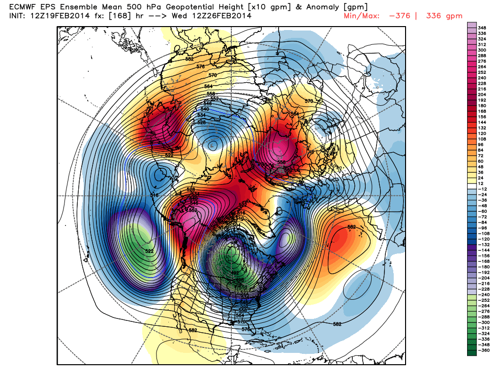 The ECMWF ensembles depict an anomalous, positive height anomaly near Alaska, with the Polar Vortex sitting near Hudson’s Bay. Greenland heights are slightly positive for mid week – not very impressive – but certainly favorable enough for something moderate to significant. The regime for mid week doesn’t look too dissimilar from what we saw in early and late January this year.