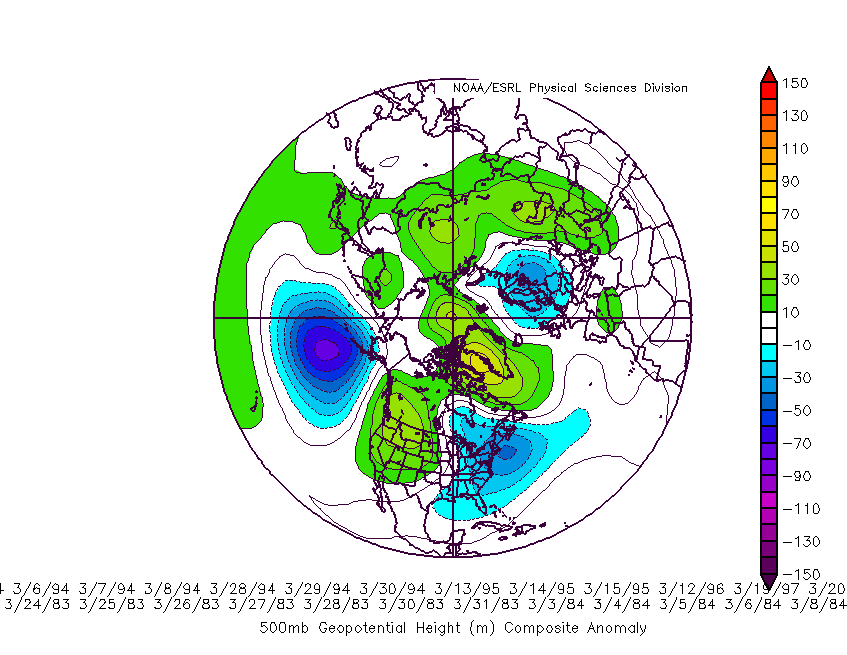 The March 500mb composite for phase 8 MJO is as follows. It would help to promote more NAO/Greenland blocking.