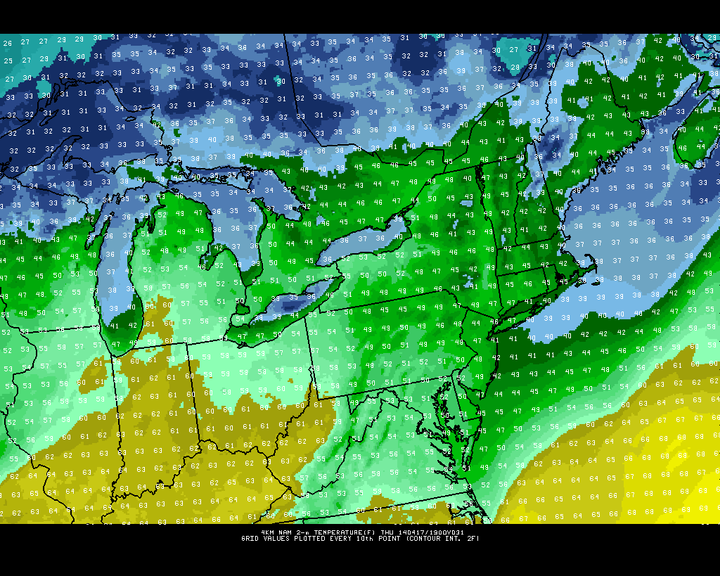 Notice how for tomorrow afternoon’s high temperatures, the forecast is colder right along the Jersey Shore, with temperatures only in the low 40s — this is because the wind is coming right off the cold Ocean. This will keep the Jersey Shore and Eastern Long Island in the low 40s for tomorrow. The city should be able to hit the mid 40s with a few isolated upper 40s, with more widespread upper 40s to perhaps around 50 further west, where a northeasterly wind is not able to bring in as much cold Atlantic air.