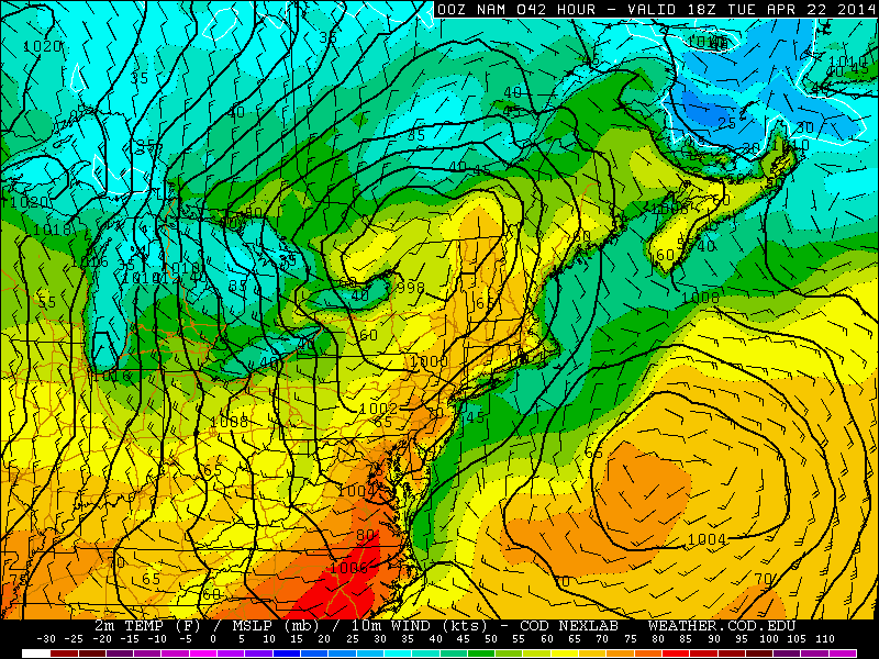Last night’s 00z NAM valid for Tuesday afternoon shows a 998mb low pressure system to our north, dragging down a cold front. We will initially be on the warm side of the cold front, which will allow some of the region to have temperatures reaching the mid 70s (weather.cod.edu).