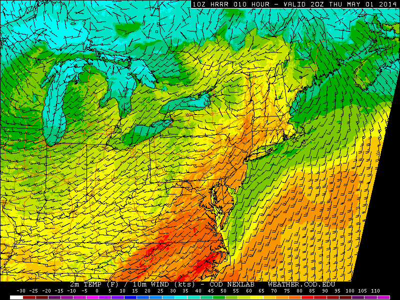 Thursday will be a different story, as the warm front will have pushed north of the region by mid-morning. South-southeasterly flow initially will keep drizzle and showers around (as well as clouds). But by afternoon, southerly winds are expected to push in a bit of a dry layer in the mid and low levels of the atmosphere. The result will be the potential for some clearing and sunshine. Mid level temperatures will have warmed fairly significantly in the “warm sector” (south of the warm front, but still out ahead of the cold front) — and as a result, temperatures could reach into the 60s and 70s.
