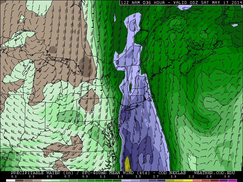 Today’s NAM valid for Friday evening shows high precipitable water values, which is an indicator that the entire atmosphere has plenty of moisture content (weather.cod.edu).