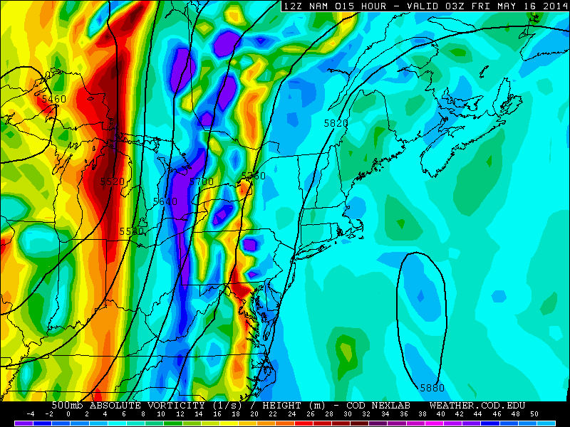 A potent vorticity maximum will also be developing on the base of the trough as it digs to our south and west, but will be moving just east of due north throughout the day Friday. This will allow the strongest lift to stay just to our west, and then pass to our north, so it “jumps” past us.