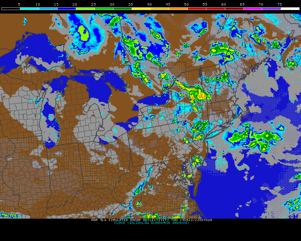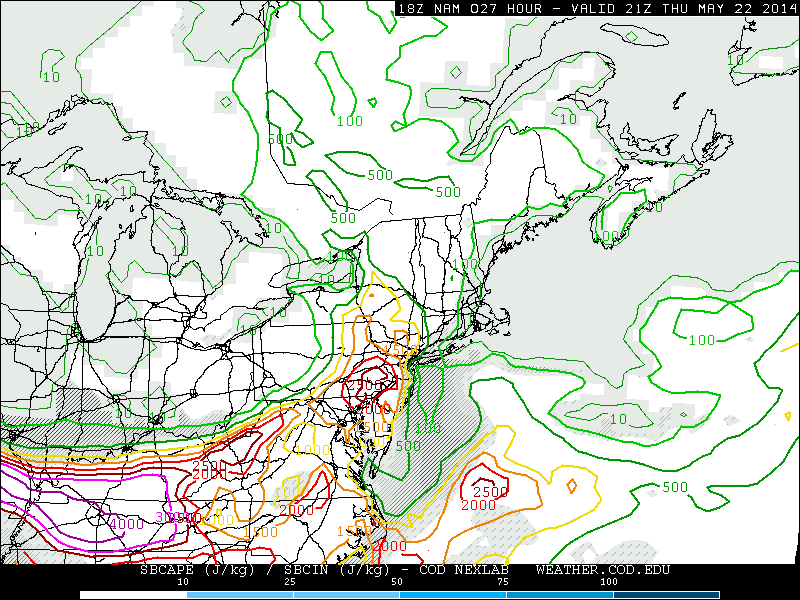 Most forecast models agree on an area of enhanced instability, centered over parts of New Jersey during the afternoon hours on Thursday. Most notably, during this time the wind direction near the coast and over much of Long Island and Connecticut shifts from southerly to east-southeasterly. This signals the influx of cooler, more stable marine air and a much lower likelihood of severe weather.