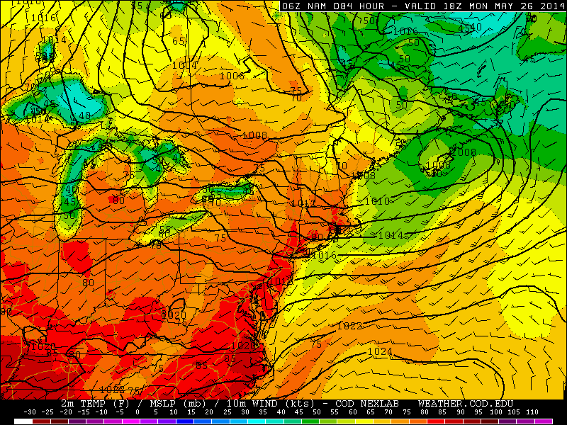NAM model showing high temperatures in the 80's on Memorial Day.