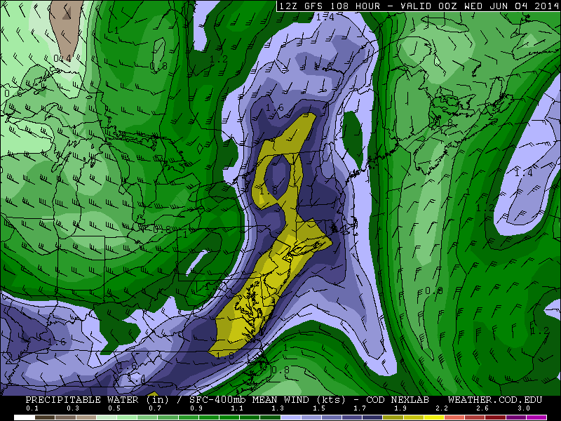 Today’s GFS model valid for Tuesday afternoon shows incredible high precipitable water values — this means that if the atmosphere were to be “squeezed out” like a wet towel, it would produce over 2″ of water. This indicates a very moist atmosphere — one that is conducive for heavy rain.
