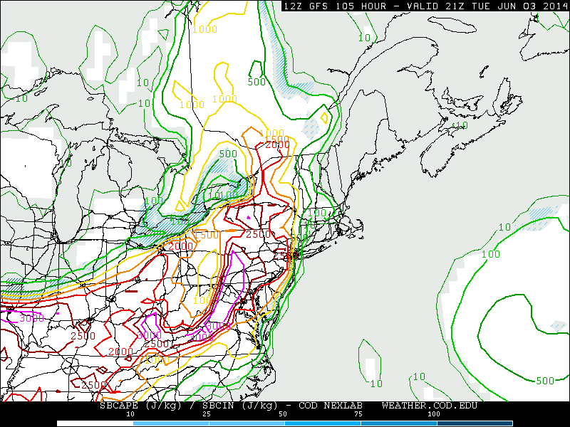 Today’s GFS model valid for Tuesday afternoon shows high surface-based CAPE (Convective Available Potential Energy), which essentially measures how much energy and instability the atmosphere has to produce thunderstorms. Any value over 1,500 J/KG can lead to severe thunderstorms (weather.cod.edu).