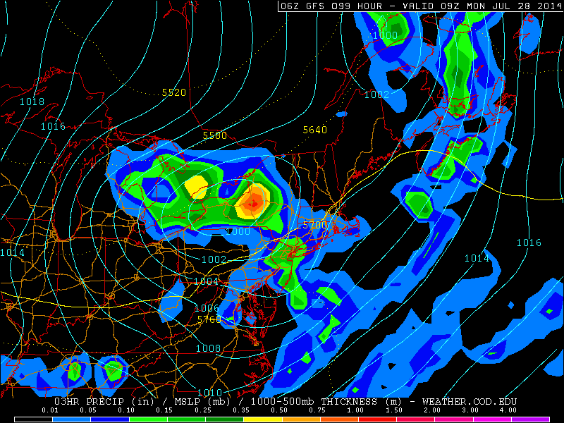 The exact track of this low pressure system will have major impacts on the sensible weather which occurs, but forecast models have come into better agreement on a track from the Northeastern Ohio Valley into Northern Pennsylvania and Upstate New York. Such a track would allow for an increase in instability near our area and much of the Mid-Atlantic states, owing to an increasing southerly flow. But the timing, as modeled currently, doesn’t support a widespread severe weather threat with the front coming through during the morning hours on Monday.