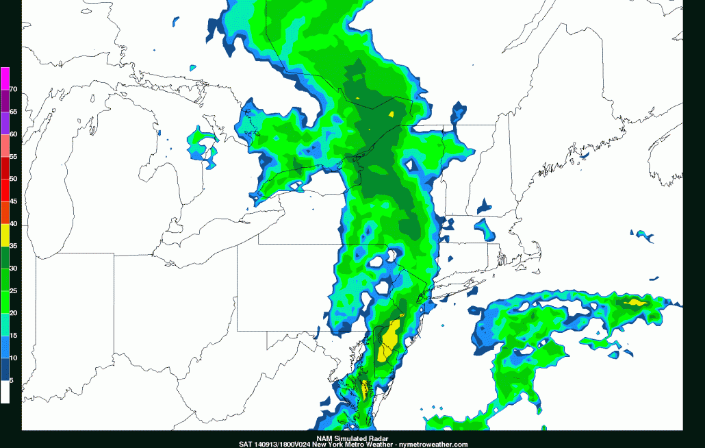 The big cold front came through last night and gave way to an absolutely gorgeous Friday, as temperatures rose into the mid to upper 70s with very low humidity and crystal clear skies. However, this is about to change, as a storm system will be developing throughout the evening, and affecting us tomorrow. The culprit is a rigorous system in the middle of the atmosphere pushing through the Great Lakes, which will help create copious lift for precipitation. Ultimately, the storm system will not become a truly organized Nor’easter, so we do not expect much in the way of heavy rain. But the fact that we have a storm system that will not be relying on convection leads us to have relatively high confidence in periods of rain throughout the day tomorrow. That being said, the lack of surface organization creates some uncertainty as to whether we will get around one tenth of an inch of rain, or closer to a half inch.