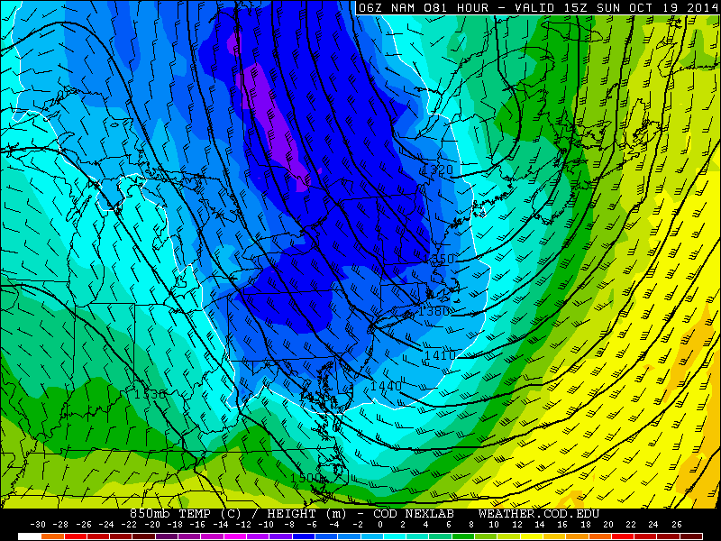 850mb temperatures falling below 0c from Saturday into Sunday will usher in one of the cooler airmasses of the season. Lows into the 30’s and 40’s will make for quite a cool Sunday morning, and highs may only reach the upper 50’s to low 60’s on Sunday afternoon as the airmass sits overhead without much modification.