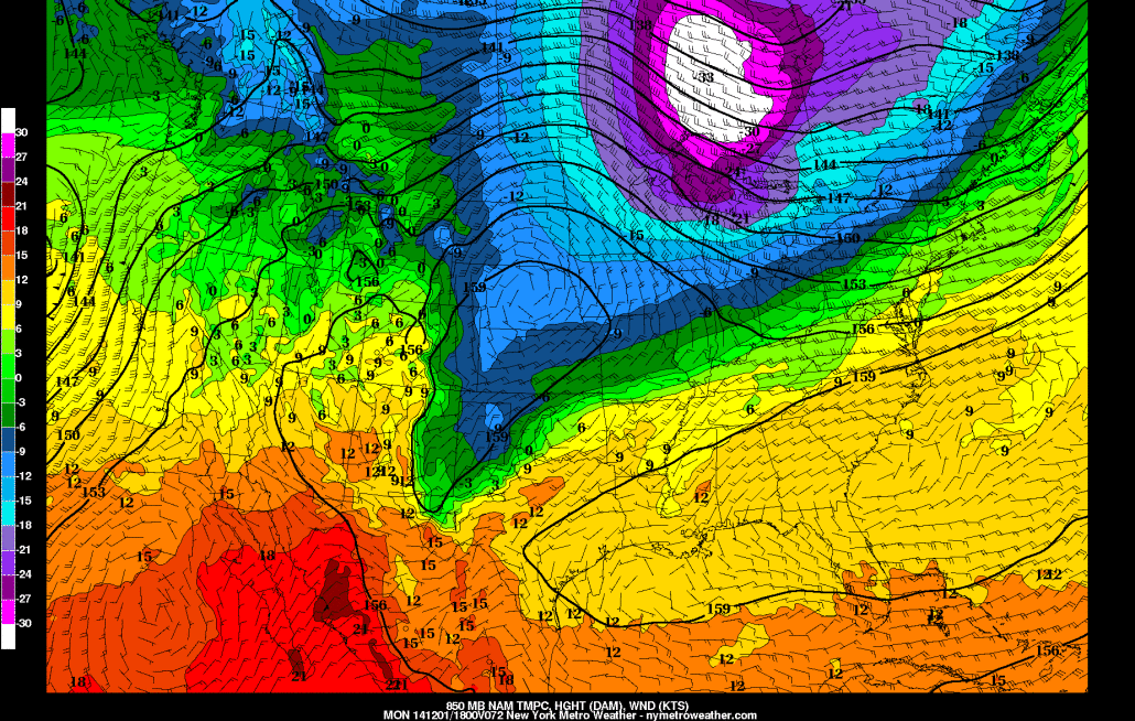 As we head to Saturday, the airmass will be modifying pretty quickly, as 850mb temperatures rise. This is because the high pressure will be moving to our east, giving us a return SW flow an an approaching warm front. However, the warm front will lead to an increase in clouds, which will prevent surface temperatures from rising much. Highs will be in the upper 30s, with the chance of some light snow showers and snow flurries — perhaps mixing with rain showers closer to the immediate coast. There is not a lot of lifting with the front, so precipitation will be spotty and not heavy — and any snow should not accumulate.
