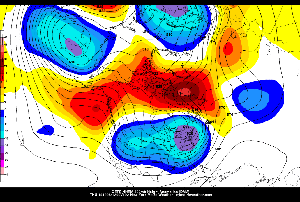 The GFS ensembles valid for Christmas morning show the “bomb” storm system helping to pump up strong ridging just south of Greenland, which is a classic way to transition into a -NAO pattern. Additionally, ridging builds in Alaska and the Gulf of Alaska, instead of bouts of troughing and Pacific air. This could lead to a cold and snowy pattern.