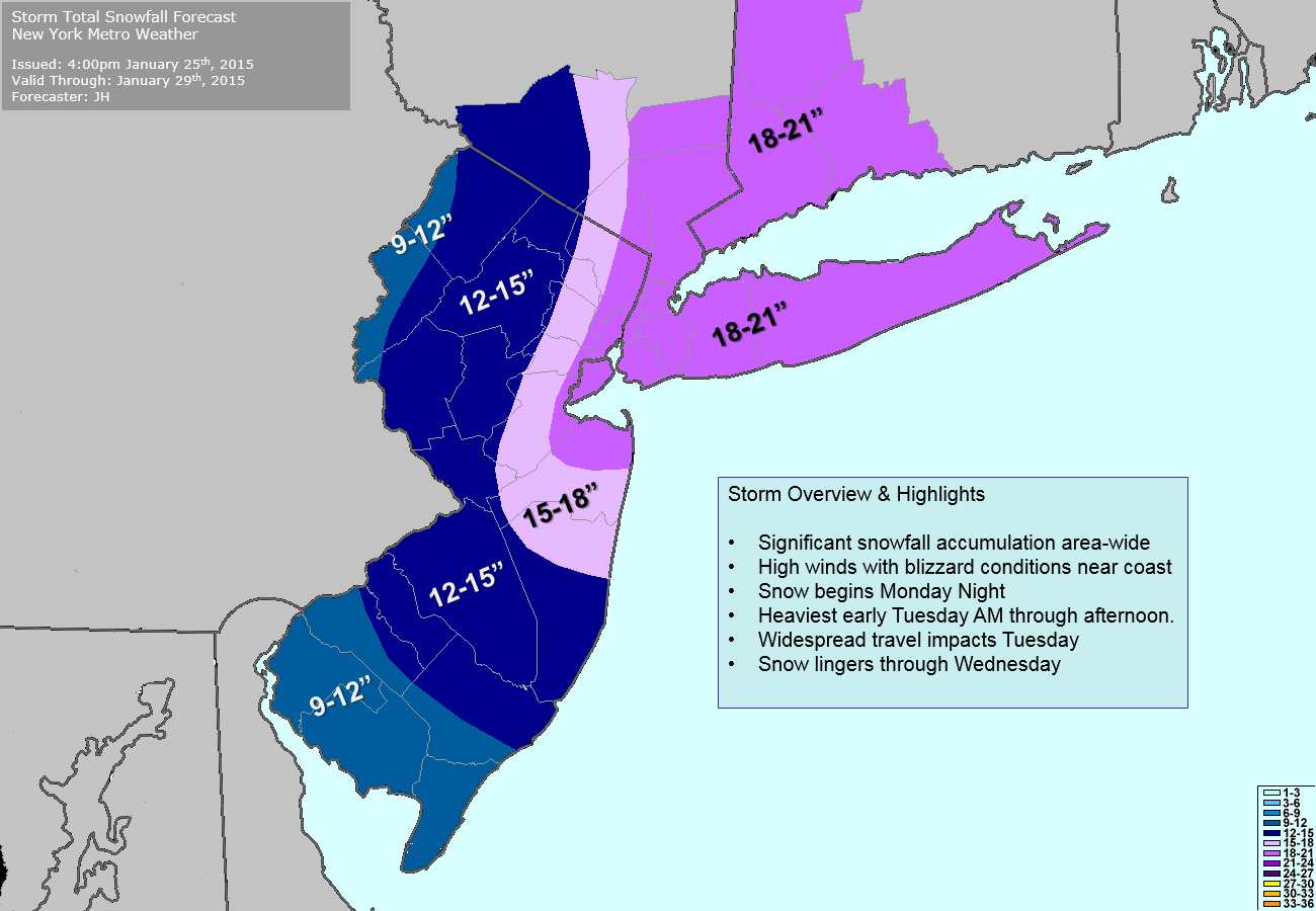 Confidence in 12” of more of snow is high for the entire forecast area. Confidence in 18” or more of snow from New York City and east is moderate to high, whereas confidence in 18” or more of snow west of New York City is low to moderate. In general, our forecast would lead to 18-24”, with locally higher amounts, from NYC and points east and northeast, with 12-18”, with locally higher amounts west of NYC.