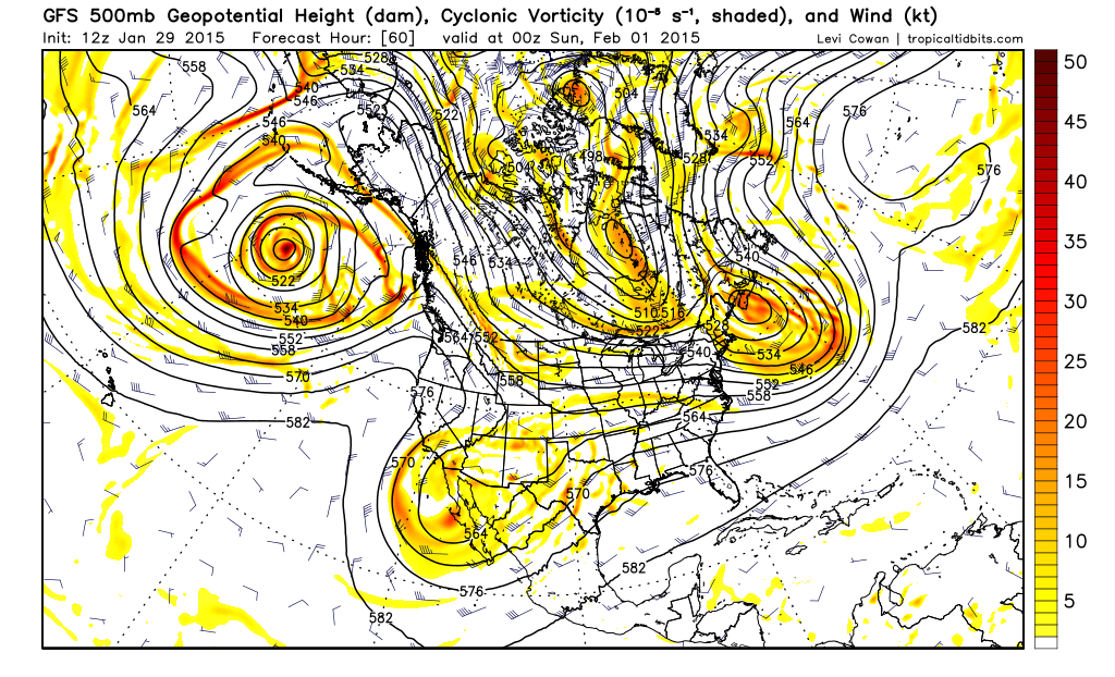 Today’s GFS model valid for Saturday night shows a favorable pattern in the middle of the atmosphere taking place for a snow event (tropicaltidbits).