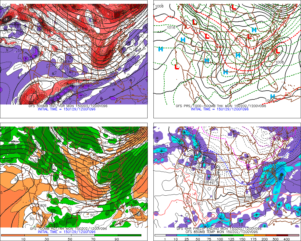 Today’s GFS valid for Monday morning shows a storm system skirting the region with plenty of moisture (PSU-eWall).