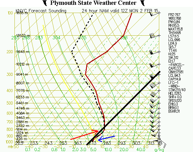 With an 850mb low (and other mid level lows) in Western Pennsylvania, southerly winds will develop at those levels. This spells trouble, because as mid level temperatures warm above freezing, any snowflake that can form will fall and melt on its way down through the atmospheric column. If the surface temperature can remain below freezing, that melted snowflake can either fall as sleet or freezing rain — but definitely not snow. This is where model forecast soundings come into play. They help us get a visualization of the atmospheric column.