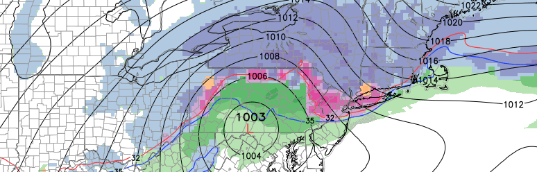 What this means for our area, is that precipitation type and amounts become less certain. The thermal gradient, essentially, is a boundary where there is a large temperature gradient over a short distance. Along and just north of this zone, enhanced lift for precipitation can occur as the development of a low pressure system is promoted near or just south of it. With this gradient trending north, forecast models have introduced warmer temperatures in the mid levels, and have shifted precipitation northward into New England.